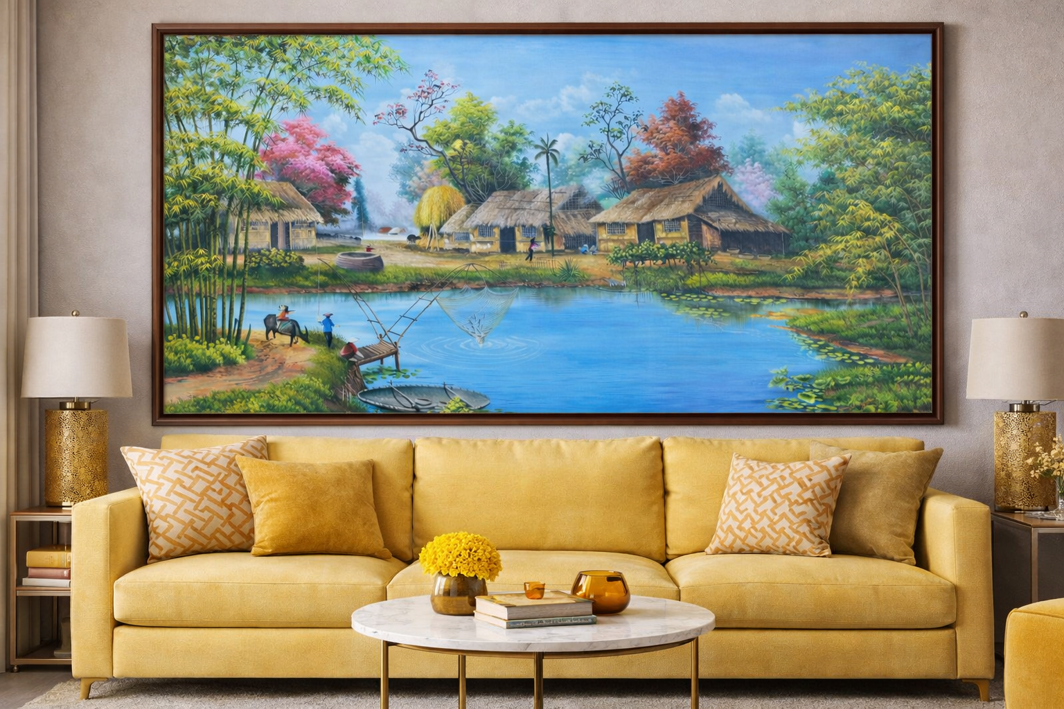 Tranh đồng quê Việt Nam, tranh đồng quê phòng khách là dòng tranh trang trí mang đậm bản sắc văn hóa dân tộc, được nhiều gia đình yêu thích nhờ vẻ đẹp mộc mạc, gần gũi và đầy hoài niệm. Hình ảnh làng quê quen thuộc như lũy tre xanh, cánh đồng lúa chín, con trâu, dòng sông, mái nhà tranh hay cảnh sinh hoạt đời thường được tái hiện sinh động, tạo cảm giác bình yên và ấm áp cho không gian sống. Treo tranh đồng quê Việt Nam trong phòng khách không chỉ giúp không gian trở nên hài hòa, thân thiện mà còn thể hiện sự trân trọng những giá trị truyền thống. Với màu sắc nhẹ nhàng, bố cục cân đối, tranh đồng quê phòng khách phù hợp nhiều phong cách nội thất, góp phần mang đến sự thư thái, gắn kết và điểm nhấn nghệ thuật tinh tế cho ngôi nhà.