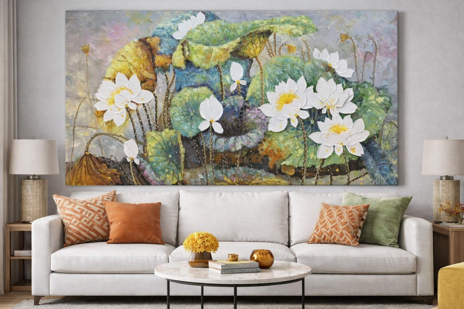 Treo tranh hoa sen sơn dầu SN1 trong nhà không chỉ làm đẹp không gian mà còn mang ý nghĩa phong thủy tốt, giúp gia chủ cảm thấy an yên và tĩnh tại.