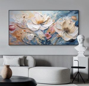 không chỉ là vật trang trí mà còn mang giá trị tinh thần sâu sắc. Hình ảnh hoa được thể hiện bằng ngôn ngữ nghệ thuật tự do tượng trưng cho sự sáng tạo, cảm xúc và vẻ đẹp nội tâm. Treo tranh hoa trừu tượng giúp không gian trở nên mềm mại, cân bằng năng lượng và tạo cảm giác thư giãn, nhẹ nhàng cho người nhìn.