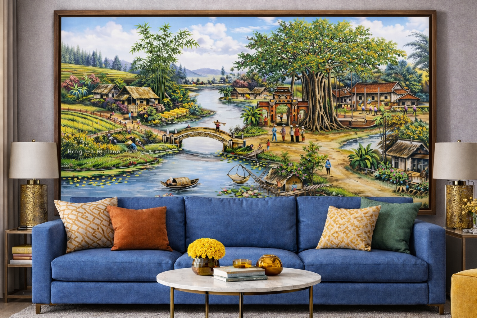 Tranh phong cảnh đồng quê là dòng tranh mang đậm nét đẹp bình dị, mộc mạc của làng quê Việt Nam với hình ảnh cánh đồng lúa chín, con sông uốn lượn, hàng tre xanh hay mái nhà tranh yên bình. Những bức tranh phong cảnh đồng quê treo phòng khách không chỉ giúp không gian trở nên gần gũi, ấm áp mà còn gợi cảm giác thư thái, hoài niệm và cân bằng tinh thần sau những bộn bề cuộc sống. Tranh được vẽ tay bằng chất liệu sơn dầu cao cấp, màu sắc hài hòa, bền đẹp theo thời gian, phù hợp với nhiều phong cách nội thất từ truyền thống đến hiện đại. Treo tranh phong cảnh đồng quê trong phòng khách còn mang ý nghĩa phong thủy tốt, tượng trưng cho sự sung túc, an yên và hạnh phúc viên mãn, là lựa chọn lý tưởng cho gia đình Việt và làm quà tặng ý nghĩa trong các dịp tân gia, lễ Tết.