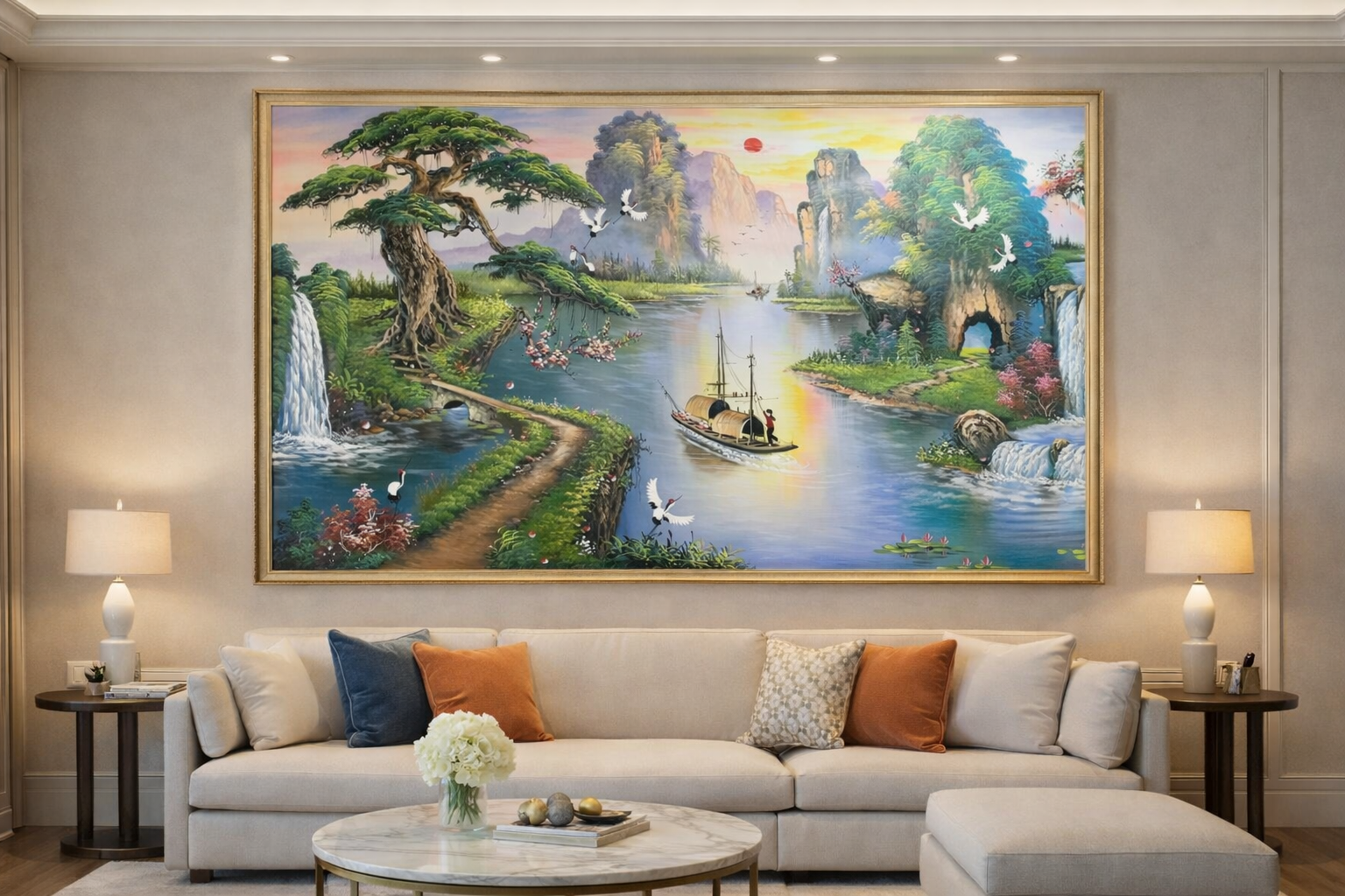 Tranh sơn thủy hữu tình phong thủy là dòng tranh nghệ thuật truyền thống, tái hiện hài hòa vẻ đẹp núi non, sông nước và thiên nhiên hùng vĩ. Bức tranh sơn thủy không chỉ mang giá trị thẩm mỹ cao mà còn có ý nghĩa phong thủy sâu sắc, tượng trưng cho sự cân bằng, tài lộc và cuộc sống an nhiên. Khi treo tranh sơn thủy hữu tình trong phòng khách hoặc phòng làm việc, không gian trở nên thư thái, trang trọng và thu hút vượng khí cho gia chủ.